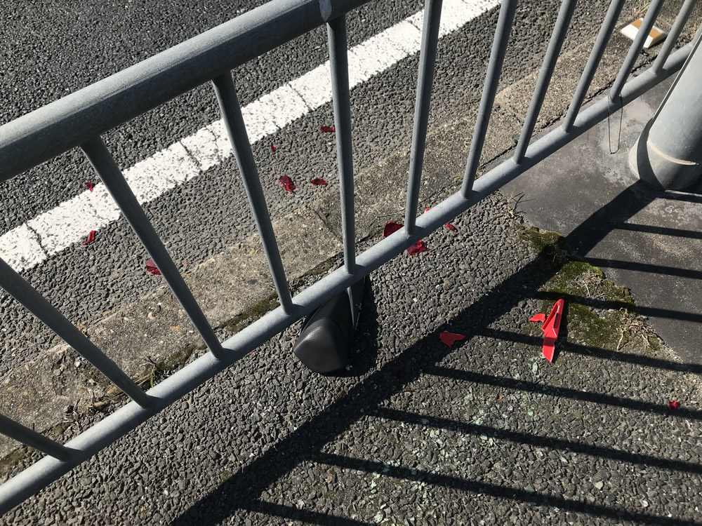 - 右斜め前に持ってかれそうになるも踏ん張ると、バイクのリアは同時に回転するので、リア部分が柵に激突、同時に私もバイクも停止する。左側のハンドルの端っこと壊れた部分で車体が止まっててタイヤは浮いてた状態。